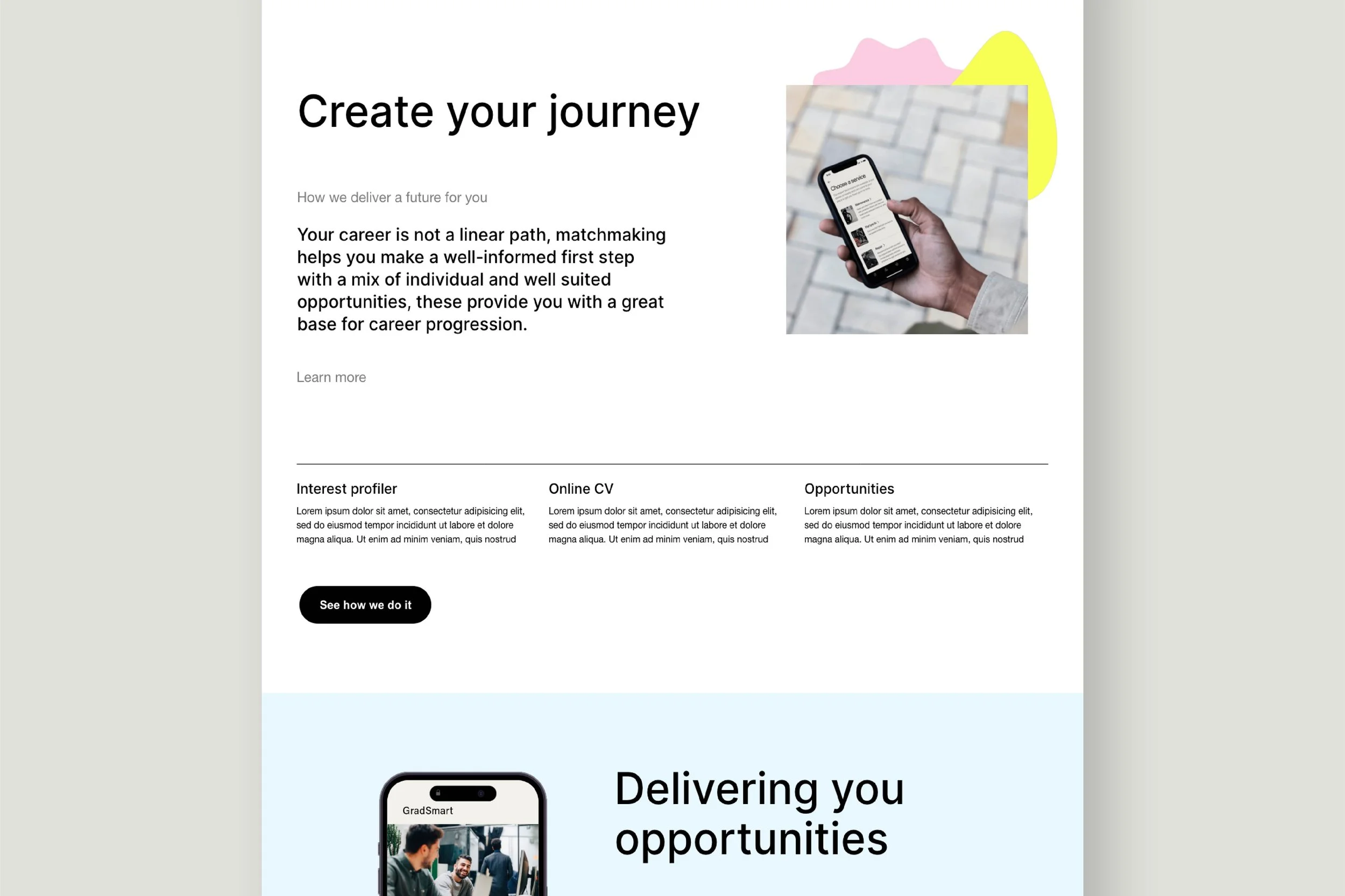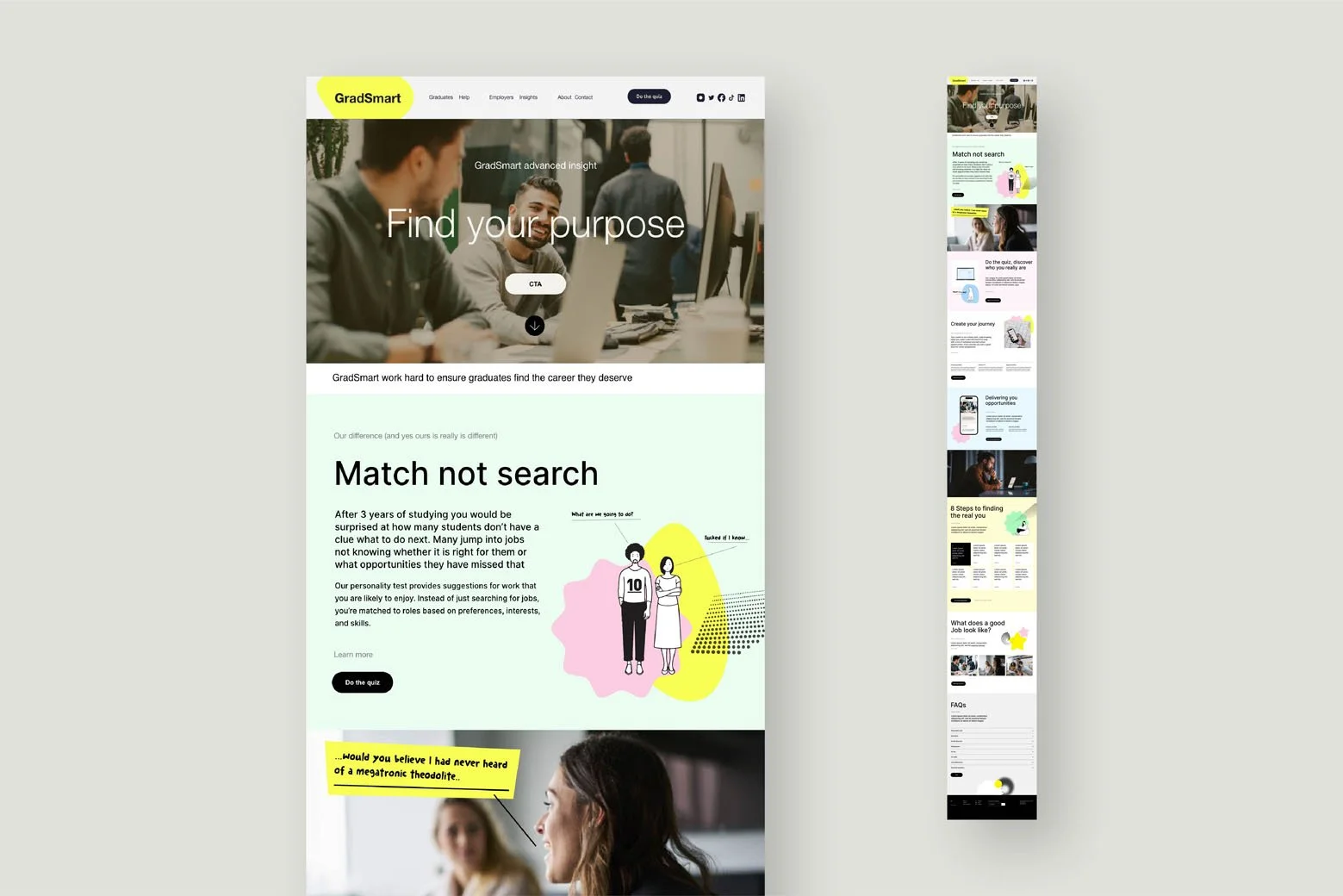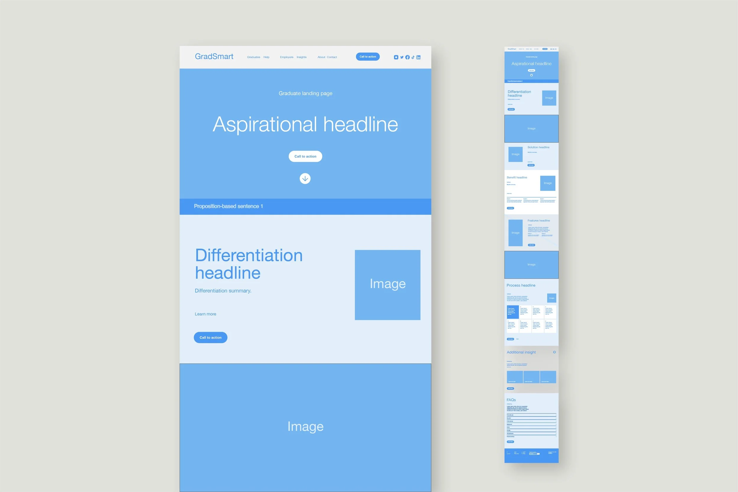 Each section flows naturally into the next, guiding graduates and recruiters from first impression through to understanding and confidence. Visual restraint, considered spacing, and a warm, human palette reinforce the message without distraction. The result is a design that feels calm, purposeful, and easy to navigate, reflecting the intent of GradSmart and supporting better decisions at every stage.
